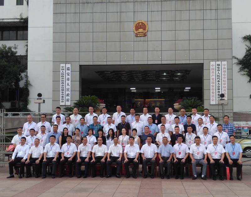 923号,瑞安市工商联第十一次,总商会第六次会员代表大会在市政会议中心大会堂召开。省工商联副巡视员黄强、温州市工商联副主席周有铭到会祝贺并讲话,我市领导陈胜峰、叶世林、白一帆、方晖、陈世尧、林济晚、陈荣臻、王建东参加会议。会议选举了新一届工商联主席(总商会会长),我公司董事长项建忠当选为工商联主席(总商会会长)。