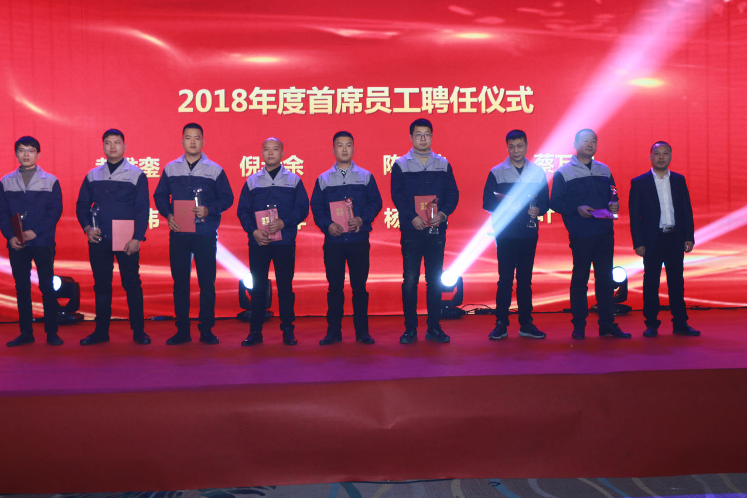 晚会对年度优秀供应商、优秀员工、优秀共产党员和销售冠军进行了表彰;聘任了2018年度15位员工为”首席员工”并颁发证书;首席员工代表徐崇灿 ,优秀员工代表胡广兵做了典型发言。